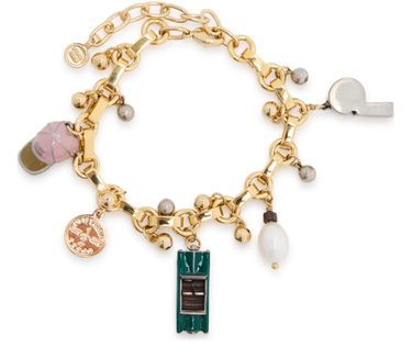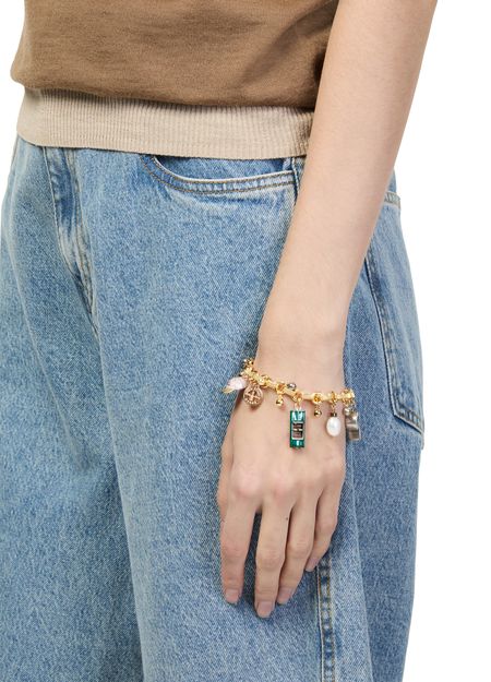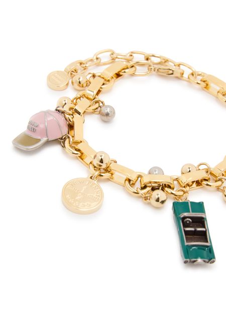 Reveal Miu Miu's multicolor jewelled bracelet, a radiant piece featuring cultured pearls and bead accents. The gold finish and chain design, secured with a spring ring clasp, create a refined statement for any occasion. Experience a modern accessory that effortlessly elevates your style.
