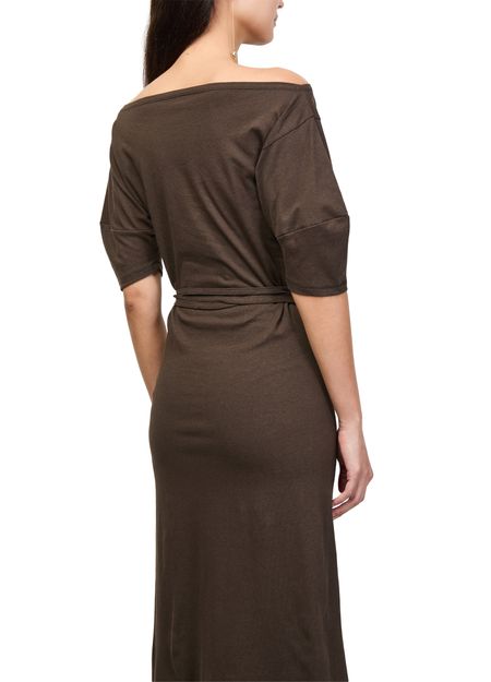 Reveal Lemaire's off-the-shoulder dress, a long silhouette with a bare shoulder neckline and dropped short sleeves. The side slit adds a modern edge, while the relaxed fit ensures effortless sophistication. Perfect for making a statement at any event with its refined, contemporary design.