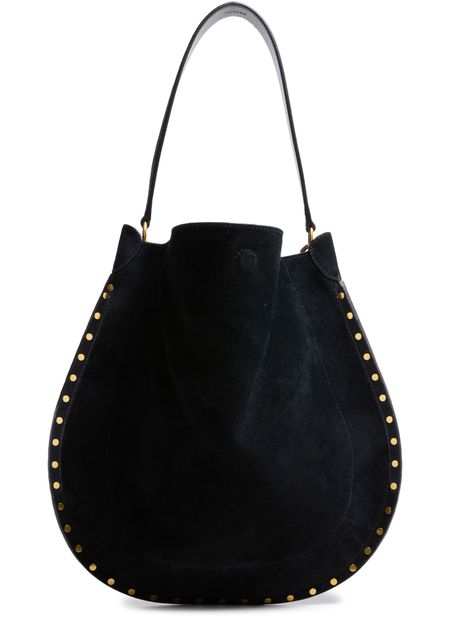 Reveal Isabel Marant's Oskan Hobo Soft Bag, a masterpiece of modern design. Crafted from luxurious suede, this hobo bag features a single handle and magnetic closure. The studded details and embossed logo add a touch of elegance, Outer edge adorned with gold-finish studs.
