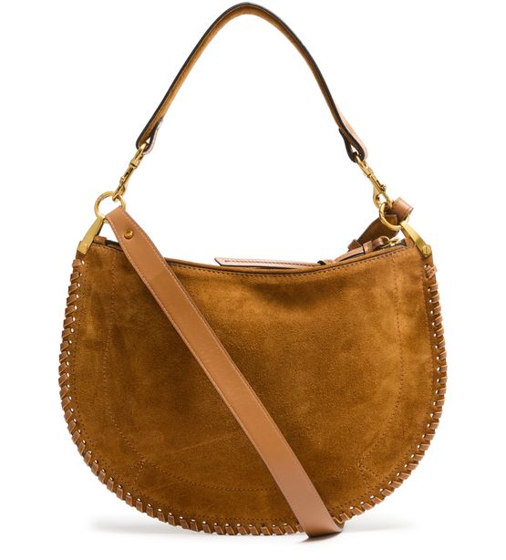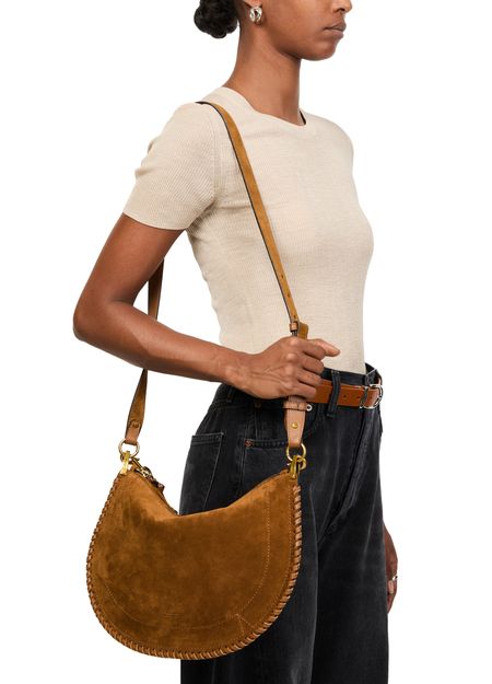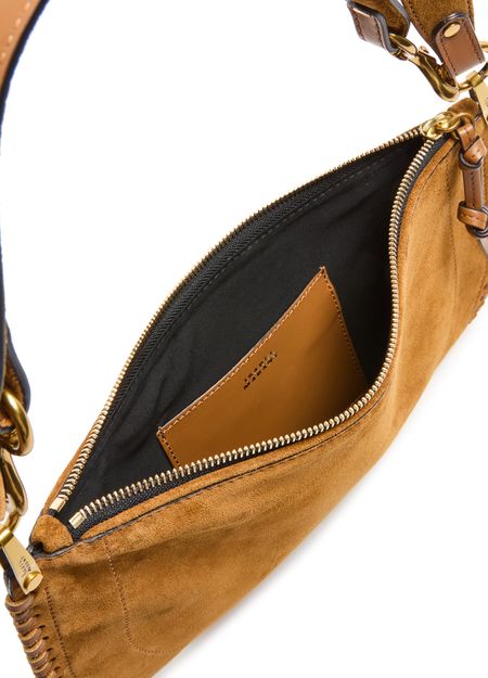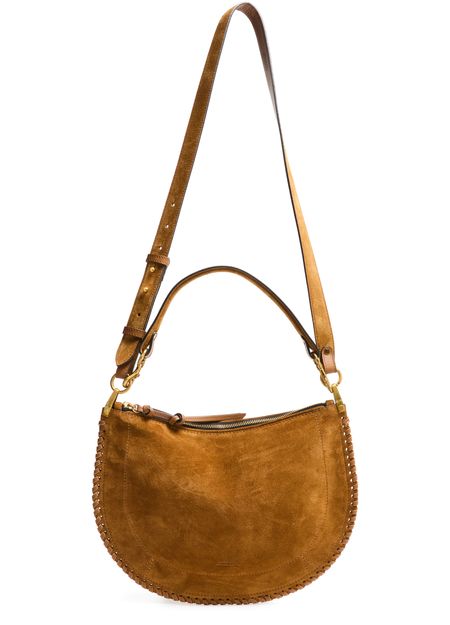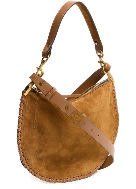 Reveal Isabel Marant's Oskan Soft Zip shoulder bag in suede with braided edges, crafted with a single handle and thin, adjustable strap for versatile wear. Gold-finish hardware, visible topstitching, and an embossed logo add refined detail, while a secure zipper closure and interior pocket ensure everyday practicality.