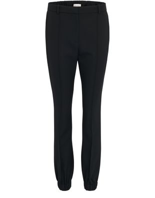 Designer Alexander McQueen offers a reinterpretation of the iconic darted pant, incorporating an elasticated waist at the back and a loose fit that narrows at the ankles.