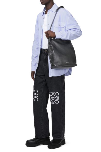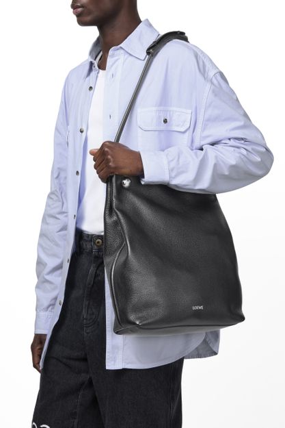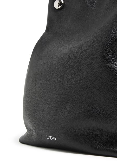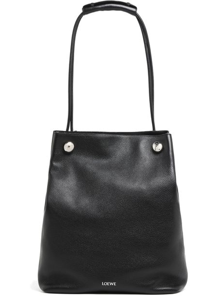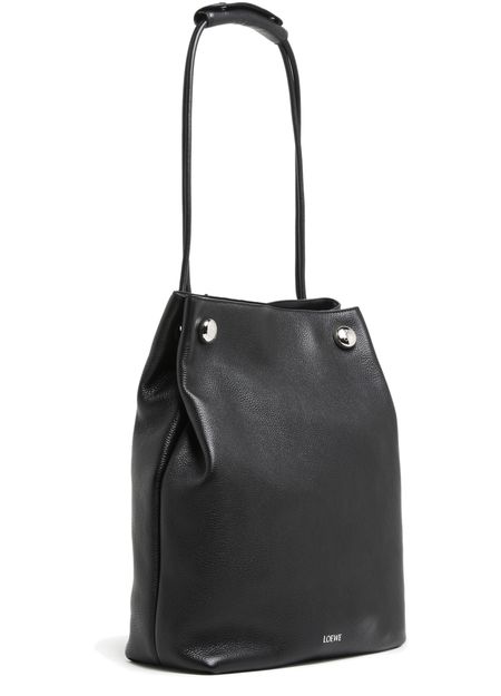 Loewe's Pebble Hobo bag showcases a single compartment design, perfect for effortless organization. Its silver finish gleams subtly, complemented by a front logo in silver letters. A zippered interior pocket secures essentials, while visible topstitching adds charm. Worn on the shoulder, the thin strap ensures comfort and style for any occasion.