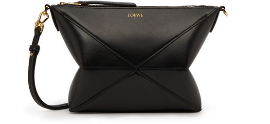 Loewe's Puzzle fold pouch features visible topstitching and a zipper closure. The logo in gold letters is displayed on the front, complemented by a thin strap with a gold finish. This versatile pouch can be worn on the shoulder with the detachable strap. It includes a single compartment with visible stitching and a carabiner for added functionality.