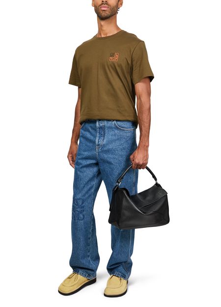 Unveil Loewe's Large Puzzle bag in grained calfskin, a masterpiece of design. This elegant shoulder bag features a single handle and an adjustable, detachable strap, offering versatile wear. The zippered front pocket and single compartment ensure practical sophistication, enhanced by visible topstitching and a refined metal finish.