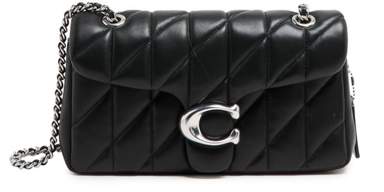 Coach's Quilted Tabby shoulder bag 26 showcases a chic flap closure and a striking silver finish. Its single handle and chain strap allow for versatile wear, while the front logo in silver letters adds a touch of elegance. The zippered interior pocket and visible topstitching enhance both style and functionality.