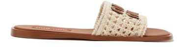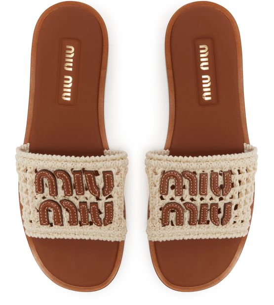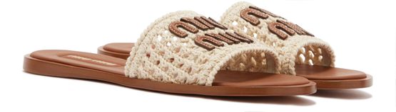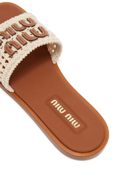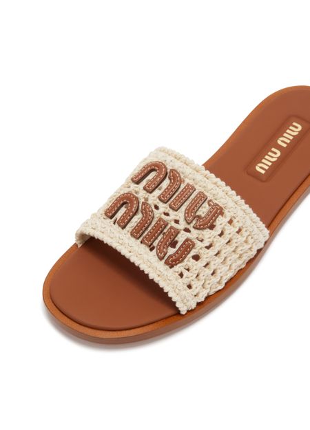 Discover Miu Miu's leather and crochet sandals, where modern design meets effortless style. These open square-toe sandals feature slender straps attached to a flat, very thin sole, highlighted by contrast details. The front logo adds a signature touch, making them a standout choice for contemporary wardrobes.