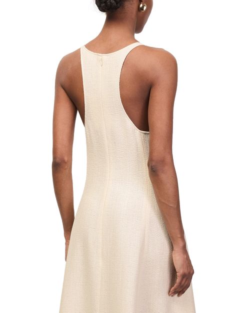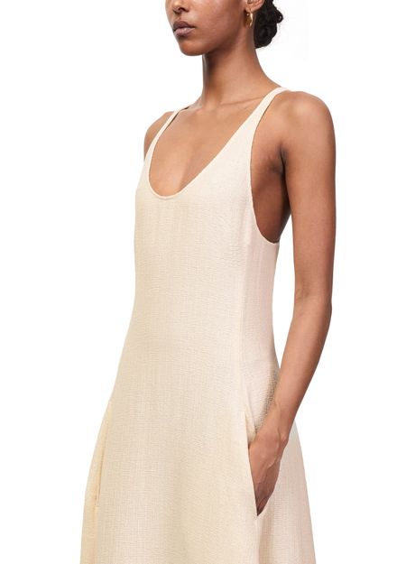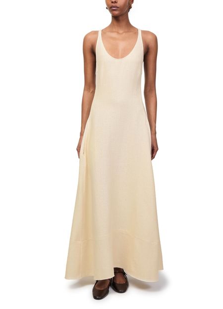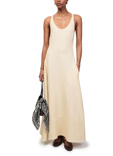 Reveal Toteme's sculpted cotton dress, a sleeveless maxi silhouette with a round neck and flared shape. Crafted from soft cotton, it features elegant shoulder straps and practical side pockets, blending comfort and sophistication for versatile day-to-evening wear.