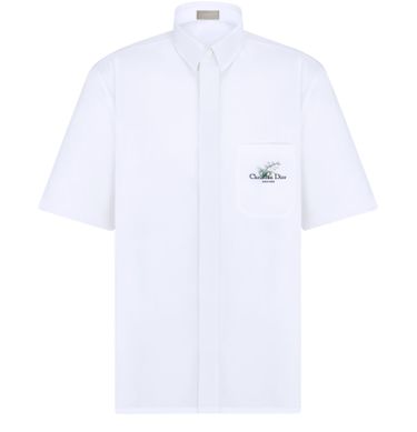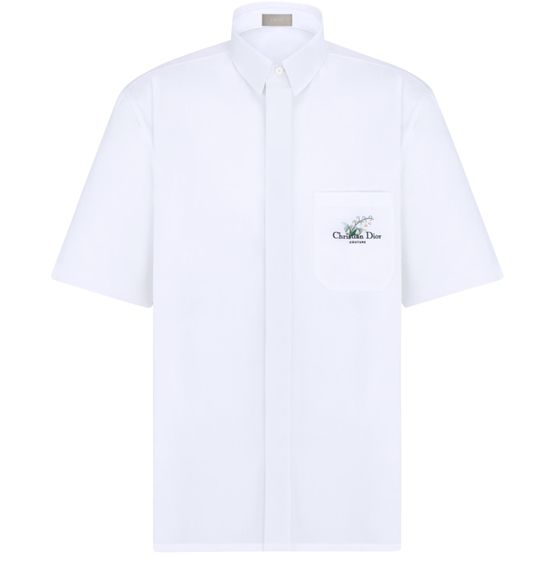 Celebrate Dior's Short-Sleeved Shirt with Christian Dior Couture Lily of the Valley Embroidery. This exquisite piece features a concealed button placket, mother-of-pearl buttons with Dior's signature, a 5.5 cm collar, a chest patch pocket, short sleeves, and a straight hem for a polished look.