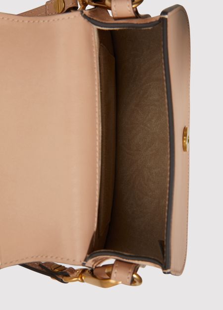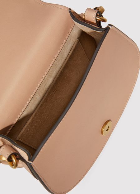 • Description : Mini bag, slender, adjustable, detachable strap, interior pocket, calfskin leather, metal with an aged gold finish, flap closure, press stud fastener, worn in the hand, on the shoulder or crossbody.