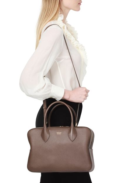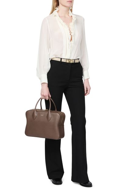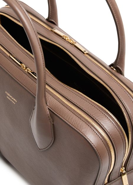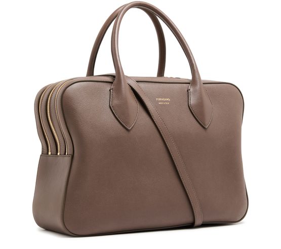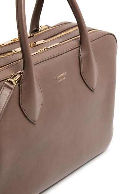 Ferragamo's Stella handbag showcases a sophisticated design with a zipper closure and double handles for versatile styling. The front logo in gold letters adds a touch of elegance, complemented by visible topstitching. With an adjustable strap, it can be hand carried, worn crossbody, or elegantly slung over the shoulder.