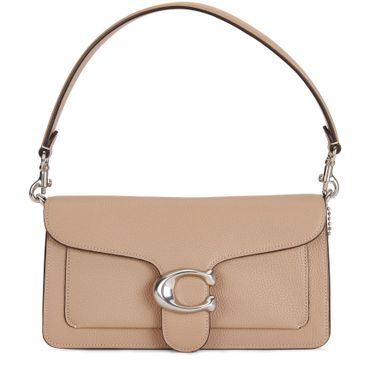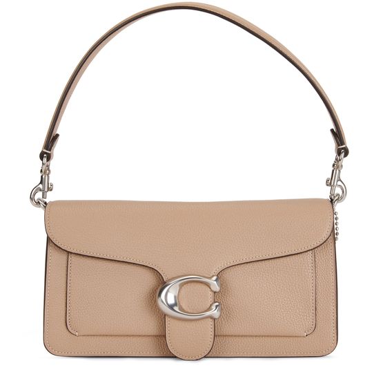 Description : Textured leather bag, adjustable, detachable strap, detachable handle, metallic logo on the front, silver finish, leather label with logo, flap closure, worn in the hand or on the shoulder.