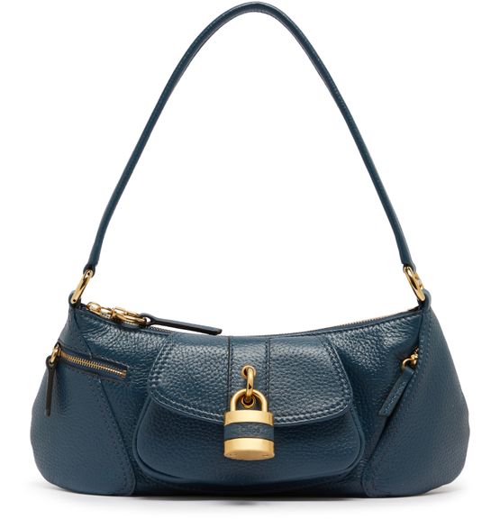 • Description : zipper closure, single compartment, gold finish, single handle, interior patch pockets, visible topstitching, worn on the shoulder, thin strap.