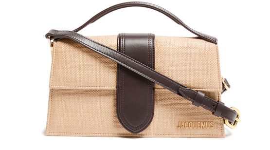 Reveal Jacquemus's large Bambino – a structured bag in woven raffia-effect with smooth leather trim adorned. Its magnetic flap, single leather handle, and thin adjustable shoulder strap showcase refined elegance. Presenting a gold metal logo and dyed edges, this piece is an embodiment of modern sophistication.