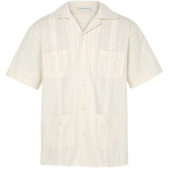 Description : front buttoned closure, visible stitching, cuban collar, shirts, patch pockets, two front pockets, breast pocket, short-sleeved, casual shirts.