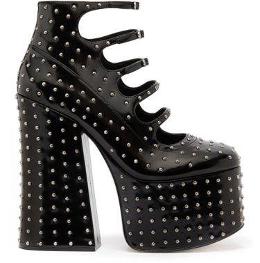 • Description : ankle strap, appliquéd logo, studded details, visible stitching, high heel, block heel, round toe, closed.