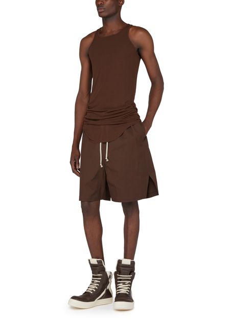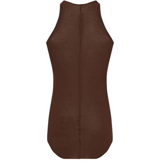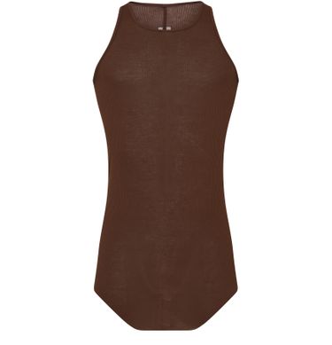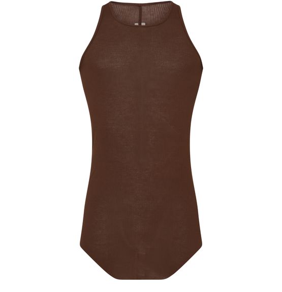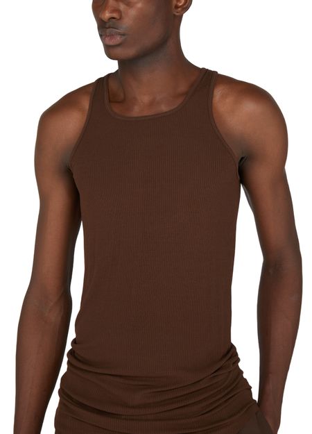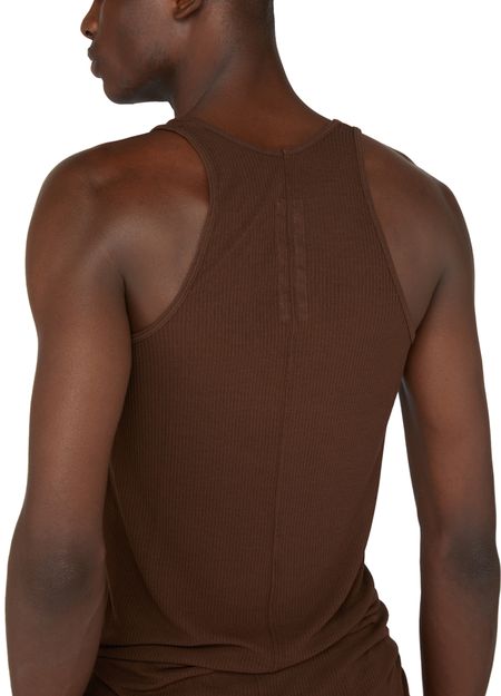 Rick Owens's top basic rib tank showcases a round neck and sleeveless design, perfect for layering or wearing solo. The subtle logo at the back adds a touch of sophistication, making it an essential piece for any wardrobe. Embrace effortless style and comfort with this versatile tank.
