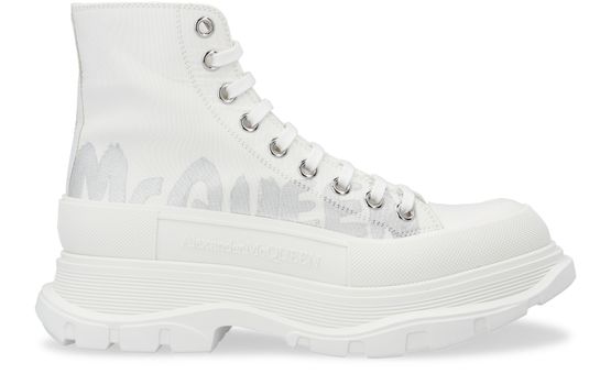 A textured logo and thick, overflowing sole with graphic elements make these Tread Slick ankle boots a wardrobe must-have. Women will be drawn to the graffiti pattern that adorns this lace-up Alexander McQueen design.
