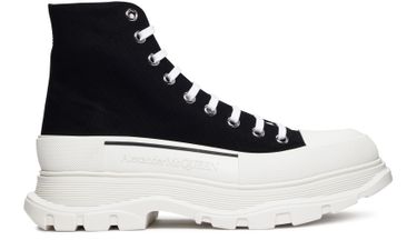 Alexander McQueen's Tread Slick sneakers feature a round toe and thick outer sole for a stylish and comfortable look. The high-top upper and closed design provide support and stability. The iconic logo on the side adds a touch of luxury to these versatile sneakers, making them an essential addition to any wardrobe.