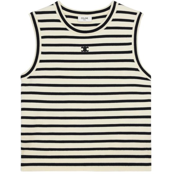 Reveal Celine's Triomphe sleeveless marinière sweater in wool, boasting a distinguished Triomphe patch. Its classic fit is enhanced by a cropped length and crew neck, finished with ribbed trim for a touch of sophistication.