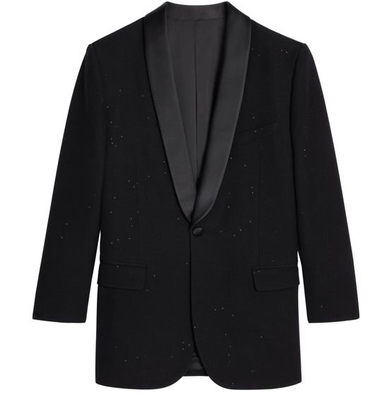 • Description : all-over micro sequins, masculine fit, tailored with front panel and shoulder pads, satin-covered shawl collar, 1 chest pocket, 2 flap pockets, interior pockets, middle back vent, 1 satin-covered button, 4 satin-covered buttons on the cuffs.