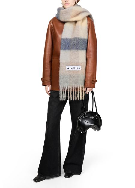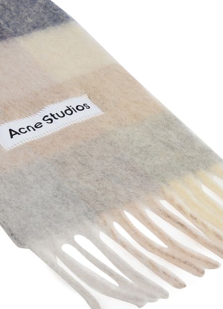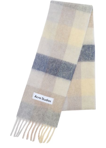 Wrap yourself in the luxurious Acne Valley Scarf with fringes. Made from a very soft material, this scarf features a classic check pattern and fringe finishes for a stylish touch. The label with logo adds a subtle branding detail. Stay cozy and chic in this timeless and versatile accessory.