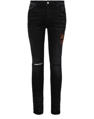 Amiri's Vintage patch skinny jean showcases a sleek silhouette with a buttoned and concealed zipper closure. Its five-pocket style includes belt loops for versatility, while the embroidered logo and back leather logo add a touch of luxury. Visible stitching enhances its design, creating a chic, below-knee length skinny fit.