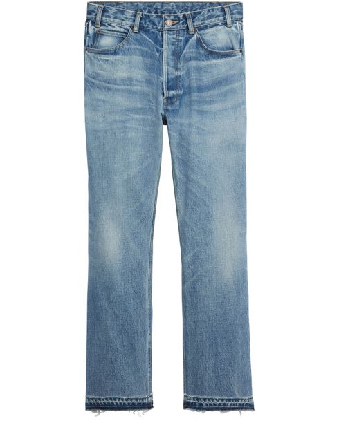 Celine Wesley jeans in pismo wash denim offer a relaxed vibe with their loose fit and low-rise design. The straight leg silhouette features five pockets adorned with rivets, while the back showcases a stylish patch at the waist. Released hems add a trendy touch, complemented by Celine's jeans-engraved zipper and button, making these jeans a must-have for effortless style.