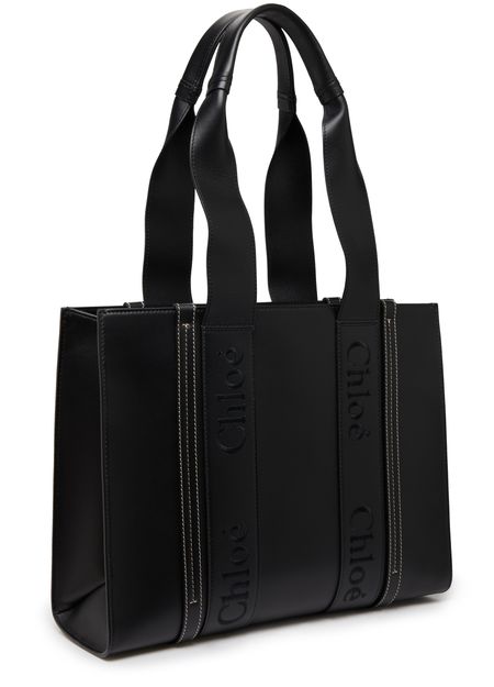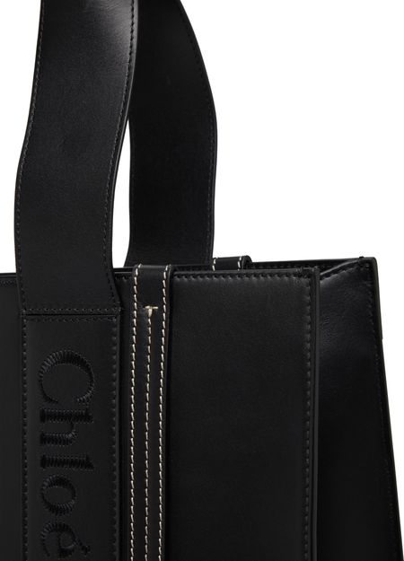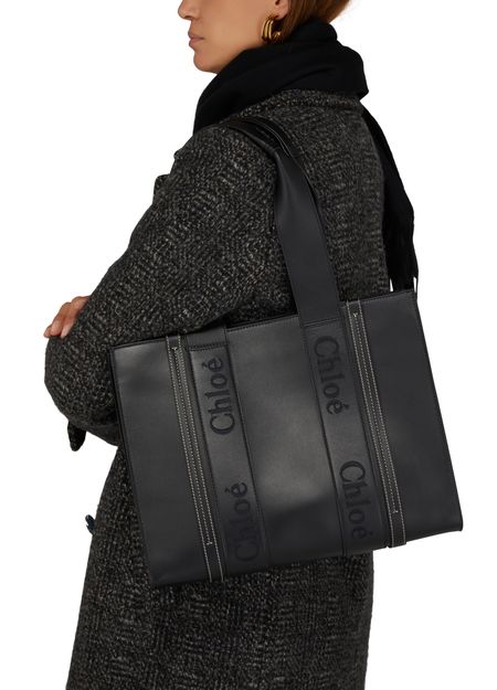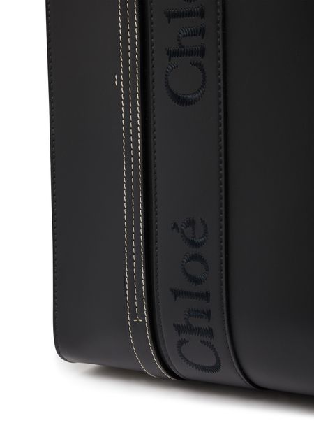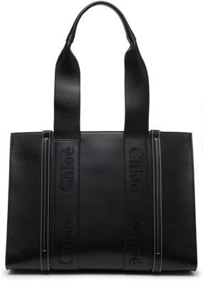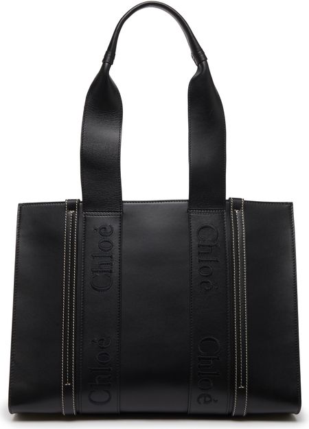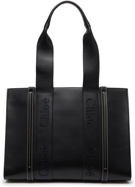 Chloe's Woody tote bag is a luxurious leather shopper with two handles for versatile carrying options. The bag features a subtle jacquard logo and visible topstitching for a modern touch. The spacious interior is lined and includes a practical patch pocket. Perfect for wearing in hand or on the shoulder.