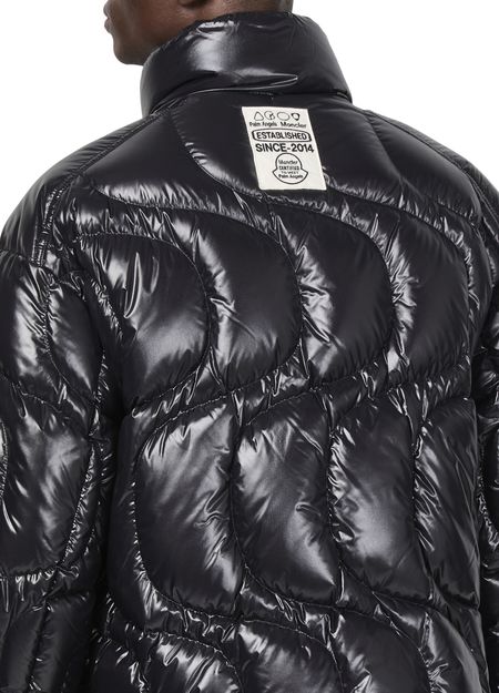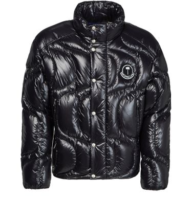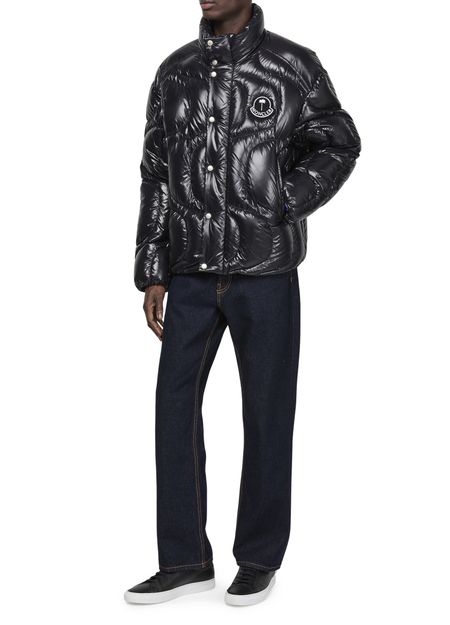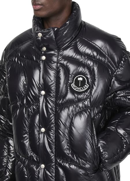 Moncler's x Palm Angels Haunani nylon down jacket combines style and functionality with its short, long-sleeved silhouette and front buttoned closure. The padded texture offers warmth, while the high neck shields against the chill. Featuring a chest logo and an appliquéd logo at the back, it includes convenient side pockets for essentials.
