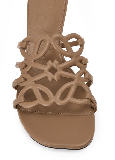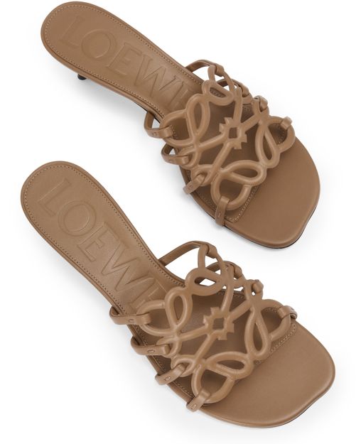 Reveal Loewe's smooth leather sandals, designed with a medium stiletto heel and an open, round toe for a refined silhouette. The logo-printed insole adds a signature touch, while the sleek construction ensures both comfort and style for any occasion.