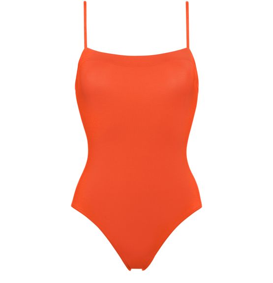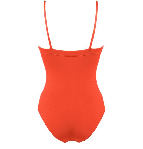 • Description : One-piece tank swimsuit, thin straps, wraparound neckline seam, straight back.
