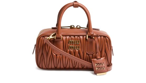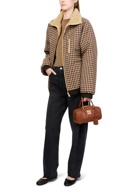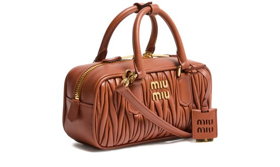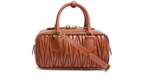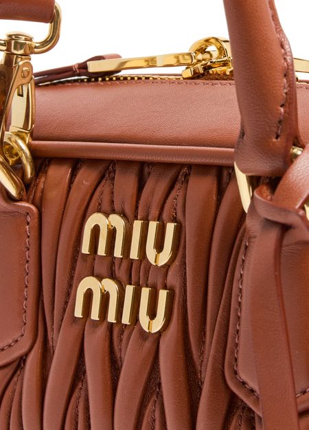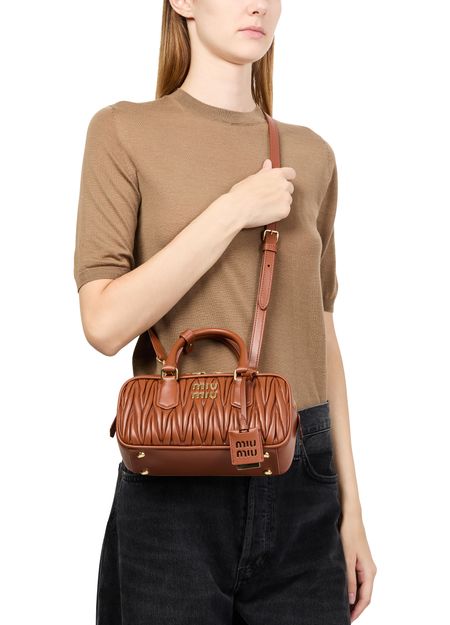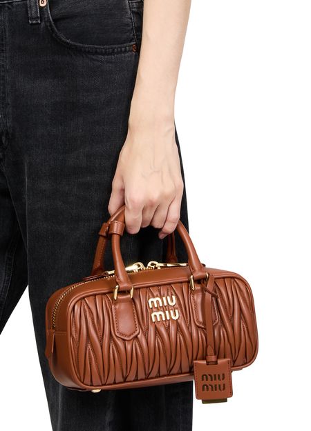 Introducing the Miu Miu Arcadie quilted nappa leather bag, crafted for the modern connoisseur. Its metallic "Miu Miu" lettering and signature quilted herringbone detail embody sophistication. Enjoy versatility with double handles and a detachable strap, all secured by a zipper closure and finished in luxurious gold.