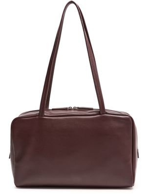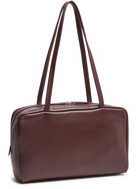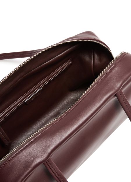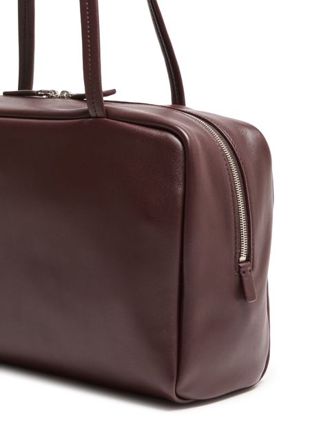 Reveal The Row's Astra bowling bag, crafted from grained leather with double handles for versatile carrying. Visible stitching and a spacious interior with a zippered pocket combine refined style and practical design, while the secure zipper closure and leather-lined interior elevate everyday essentials.