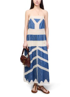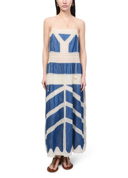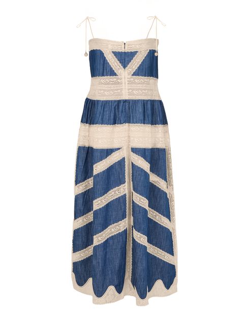 Reveal Zimmermann's Awaken denim négligée dress, crafted from faded denim for a contemporary edge. The rectangular neckline and sleeveless silhouette are complemented by delicate lace details and shoulder straps. A back zipper closure ensures a sleek fit, making this piece perfect for both daytime outings and evening events.