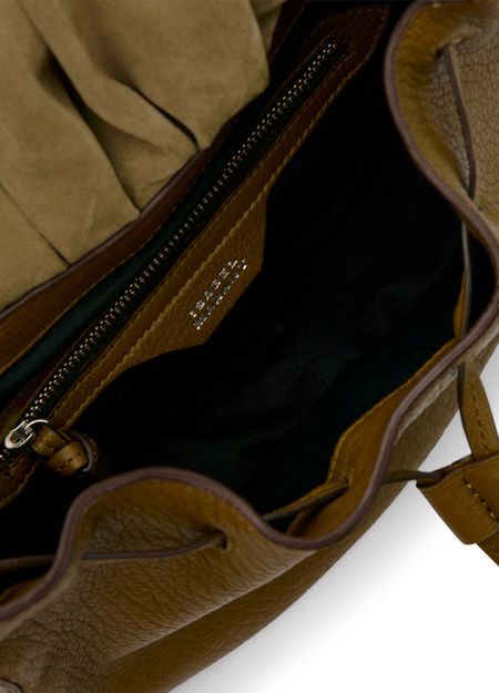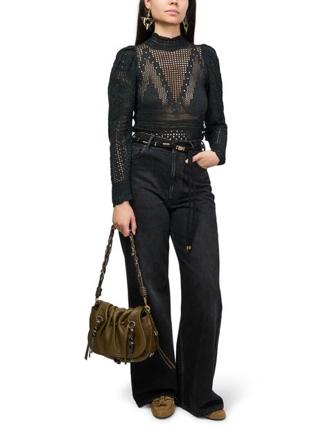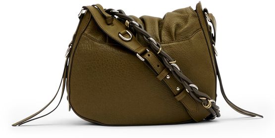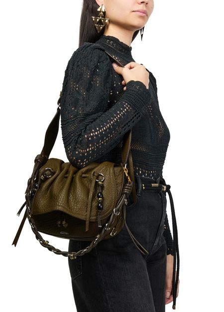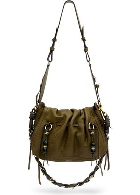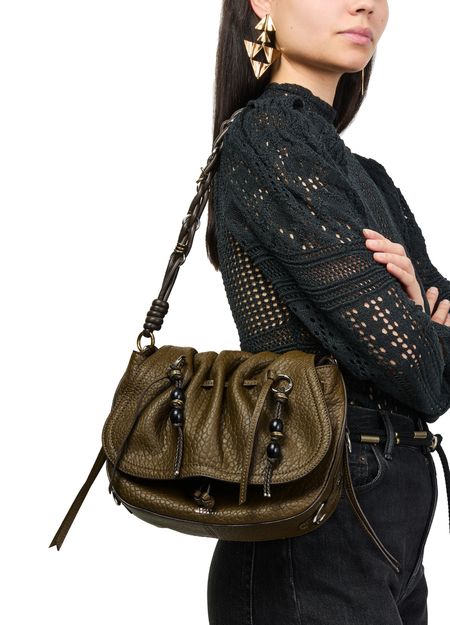 Reveal Isabel Marant's grained leather shoulder bag, a statement piece defined by its decorative chain strap and gold finish. The visible stitching and bead details showcase refined craftsmanship, while the drawstring closure and single handle offer both style and practicality for modern versatility.