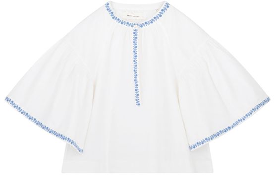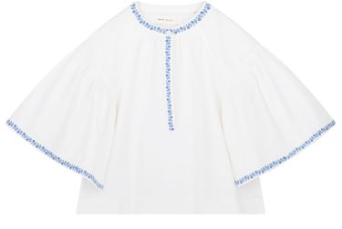 Reveal Skall Studio's bonne blouse, featuring a round neck and flared three-quarter sleeves for a refined silhouette. The soft drape and subtle details make this top effortlessly versatile, pairing seamlessly with tailored pants or casual denim for a polished, modern look.