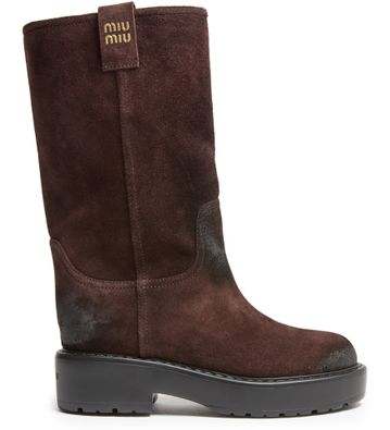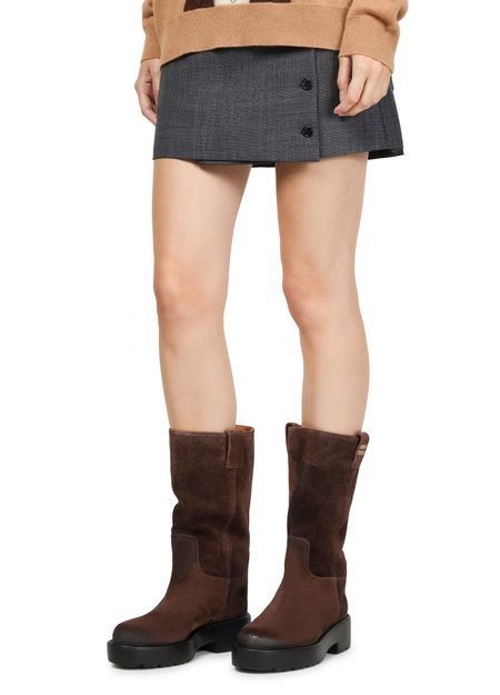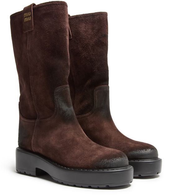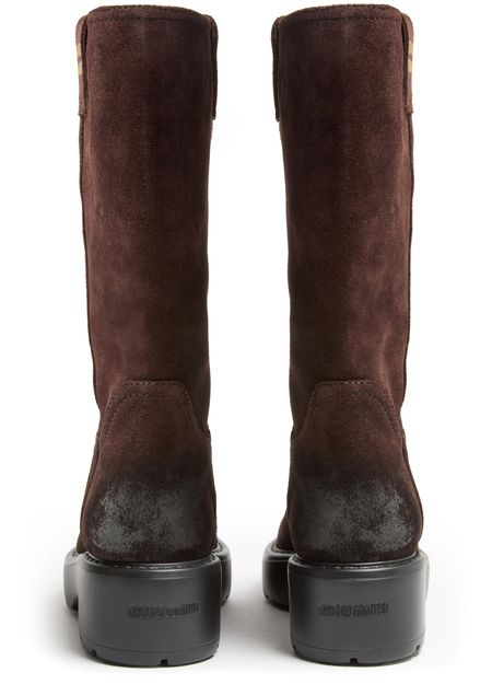 Discover Miu Miu's calf-height suede boots, a modern masterpiece with a logo in gold letters, featuring a low heel and a thick outer sole. These boots, adorned with visible stitching and crafted from luxurious suede, promise style with every step.