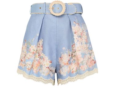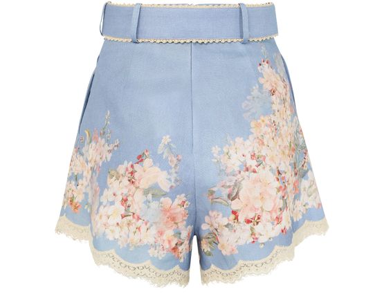 Reveal Zimmermann's Cascadian Tuck shorts, an embodiment of elegance with their high-waisted fit and floral print. Featuring lace details and scalloped edges, these shorts offer a sophisticated touch. Practicality is ensured with button fastening and side pockets, making them ideal for both casual outings and warm-weather styling.