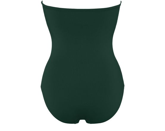• Description : One-piece bustier swimsuit, bust shirring at front and sides, u-shaped metal link between cups, gripper tape.