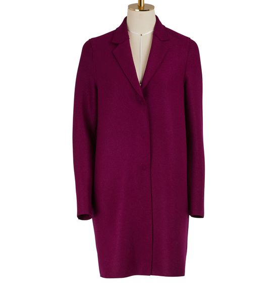 Harris Wharf features refined lines on this cocoon wool coat. The London-based brand is well-known for its coats and blazers in impeccable cuts and bright colors. This piece is offered in multiple deep colors and displays a notched lapel collar and three invisible buttons. Wear this model over a funnel neck sweater and neutral slim-fit pants to let its contrasting color shine through.