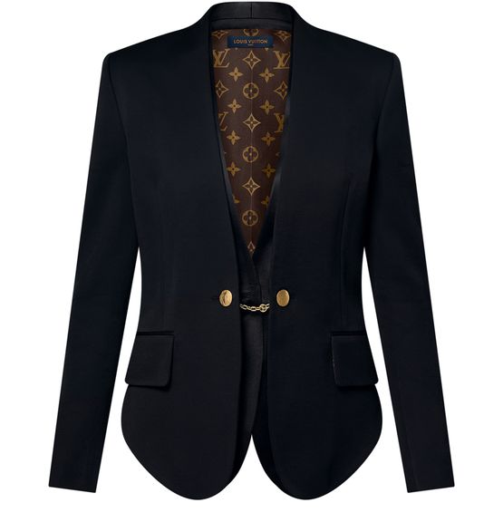 • Description : Clean collarless cut with rounded hem and cropped back, silk lining with subtle trompe-l’œil effect, classic closure with elegant chain, hammered gold buttons.
