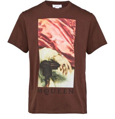 McQueen's Cotton t-shirt showcases a classic crew neck and short-sleeved design, perfect for effortless style. Its unique printed details add a touch of artistry, while the visible stitching highlights impeccable craftsmanship. This t-shirt embodies a modern aesthetic, making it a versatile staple for any wardrobe.