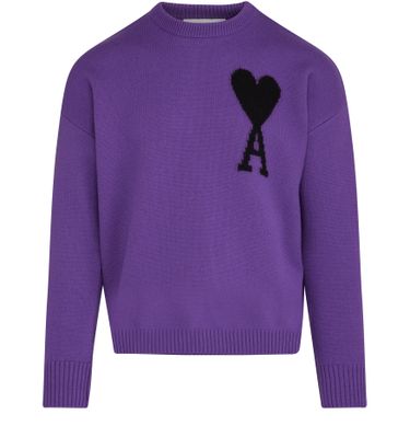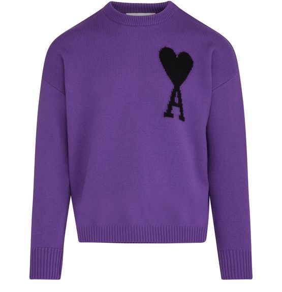 Ami's Crewneck sweater is a knit sweater with long sleeves, a round neck, and ribbed detailing. It has a boxy fit and features a chest logo for added style.