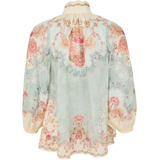 Reveal Zimmermann's Daylight blouse, a refined top featuring a high-neck and three-quarter sleeves. The delicate floral print and button fastening add a sophisticated touch, making it perfect for elevating both casual and formal ensembles with effortless grace.