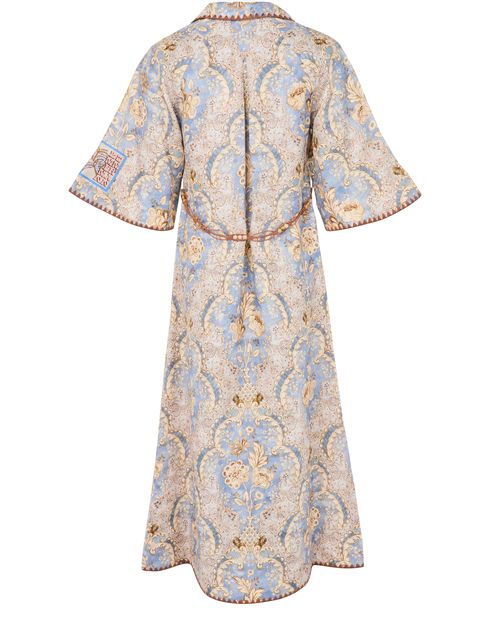 Reveal Zimmermann's Daylight midi dress, adorned with a vibrant floral print and elegant three-quarter bell sleeves. The tailored collar and wraparound silhouette are enhanced by scalloped and topstitched edges, while contrast stitching adds a refined touch. Perfect for elevating your style at any occasion.