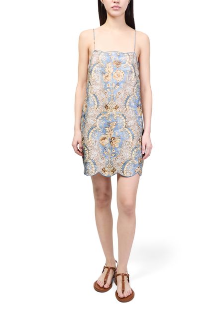 Reveal Zimmermann's Daylight Scallop mini dress, a sleeveless floral print piece with a rectangular neckline and delicate scalloped edges. The back zipper closure and shoulder straps add a refined touch, making this mini dress a standout choice for both daytime events and evening gatherings.
