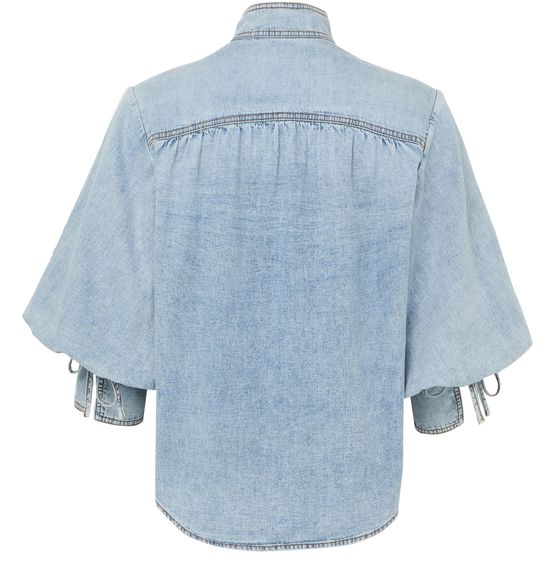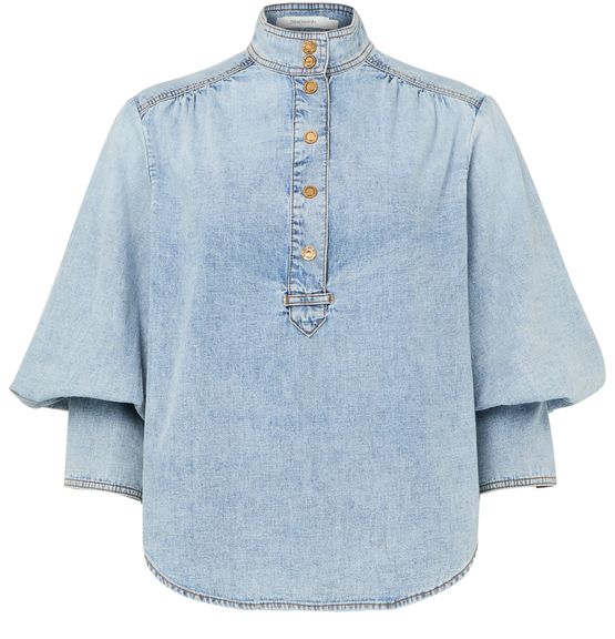 Reveal Zimmermann's denim blouse, crafted from premium denim with a high-neck silhouette and three-quarter sleeves. The front buttoned closure and contrast stitching add a refined touch, making this top a versatile choice for both casual and elevated ensembles.
