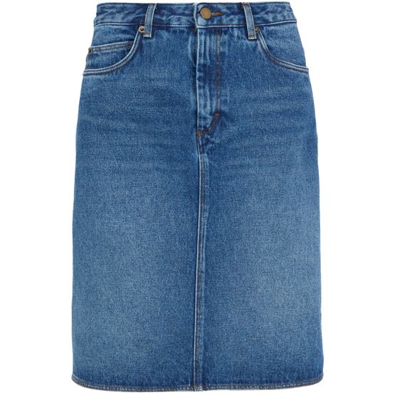 • Description : buttoned and concealed zipper closure, belt loops, back leather logo, visible stitching, knee length, front and back pockets, a-line skirt.