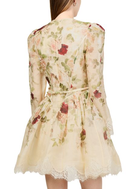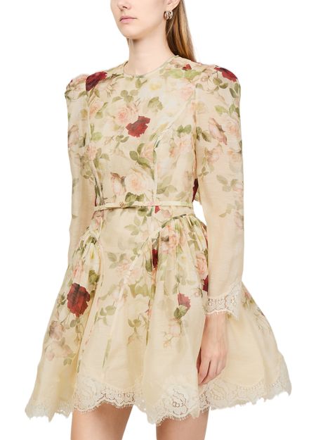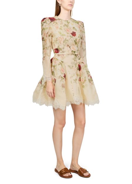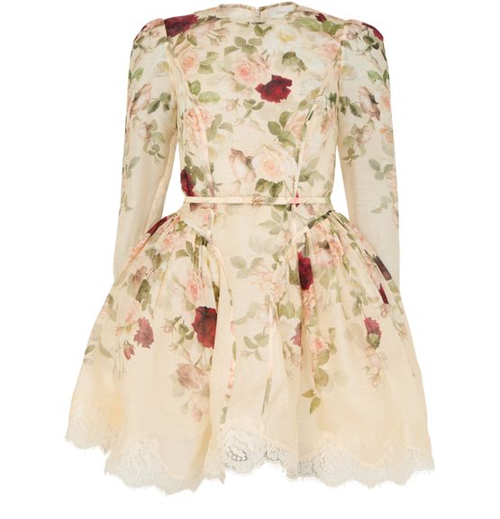 Reveal Zimmermann's tiered dress, a floral print mini dress that captivates with its slim fit and round neck. The long puff sleeves and back zipper closure add a touch of elegance, while lace details and scalloped edges enhance its charm. Perfect for any occasion, this dress is a true statement piece.
