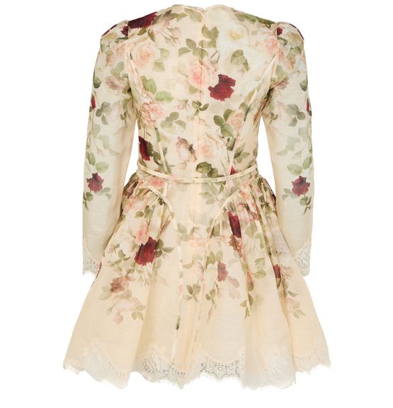 • Description : Floral print, mini dress, round neck, puff, long-sleeved, pleated details, belted waist, back zipper closure, lace details, scalloped edges.